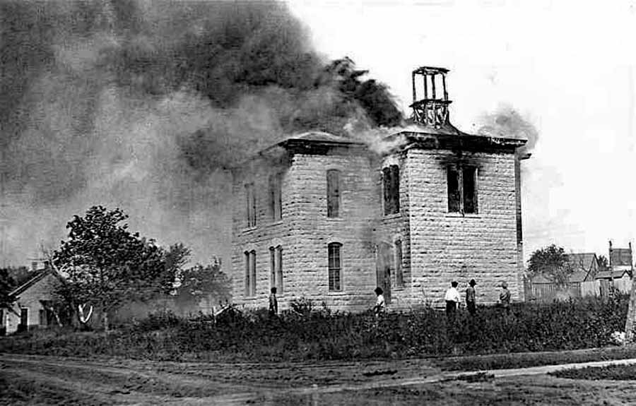 The first electric light plant was built by Frank Gulick. The first Chautauqua was held; it was the beginning of a nineteen year tradition. The school house on Maple street burnt down. The fire was caused by fumigation. Below is the burning structure. ![]() |