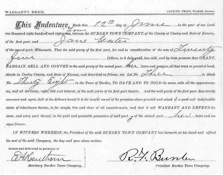 In the early history of Kansas, Burden is described as the child at the railroad in-as-much it came to the railroad rather than the railroad coming to it. In 1879 the town site of Burden was surveyed by a town company consisting of R. F. Burden, Ford, and Leonard, O. B. Gunn and T. K. Johnson. R. F. Burden was the chairman of this company and the town was so named in compliment to him. The ground for the site was purchased from Isaac Gatton and, Finley Graham.